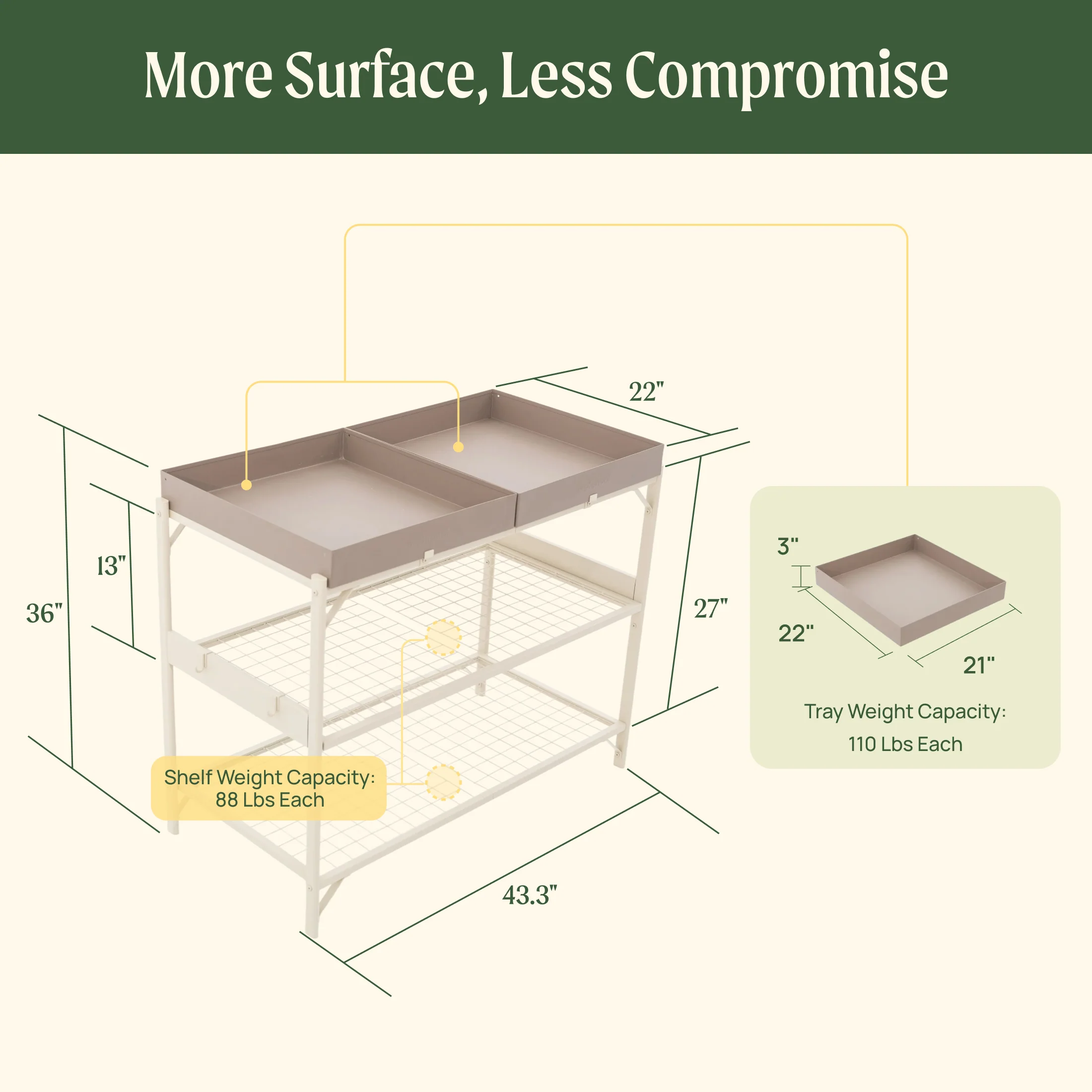 More Ways to Work: Thoughtfully designed surface space for potting, staging plants, and keeping tools organized—without cluttering your workflow.